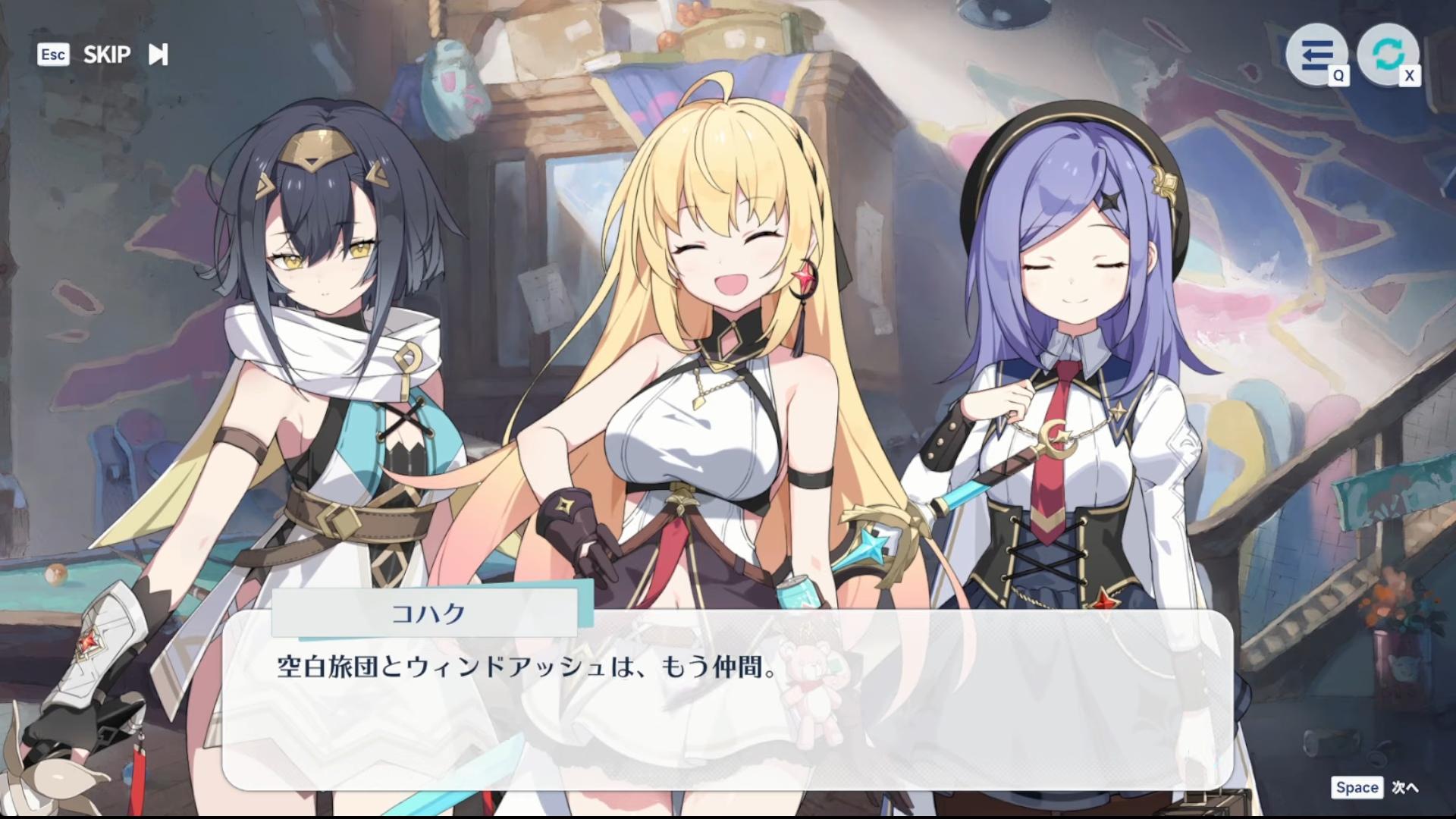 初期3キャラ+魔王+ウインドアッシュ+チトセ?の商会。プレイアブル候補は7キャラ?
